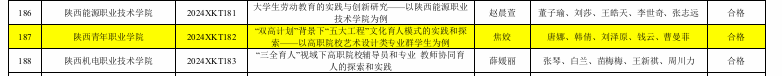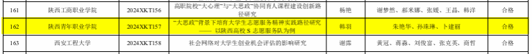 近日,中共陕西省委教育工委发布《关于公布2023年度陕西高校学生工作精品项目和2024年度研究课题结项(题)验收结果的通知》,经专家评审、现场答辩、工委研究和结果公示等程序,我校学前教育系辅导员韩羽主持的《“大思政”背景下培育大学生志愿服务精神实践路径研究——以陕西高校S志愿服务队为例》和文化传媒系辅导员焦姣主持的《“双高计划”背景下“五大工程”文化育人模式的实践和探索——以高职院校艺术设计类专业群学生为例》通过了2024年度陕西高校学生工作研究课题结题验收。