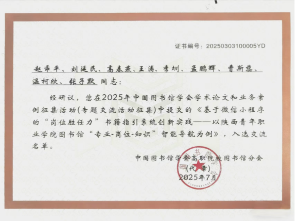 近日,2025年中国图书馆学会学术论文和业务案例征集活动(专题交流活动征集)结果揭晓,我校图书馆报送的业务案例《基于微信小程序的“岗位胜任力”书籍指引系统创新实践——以陕西青年职业学院图书馆“专业-岗位-知识”智能导航为例》入选交流名单。