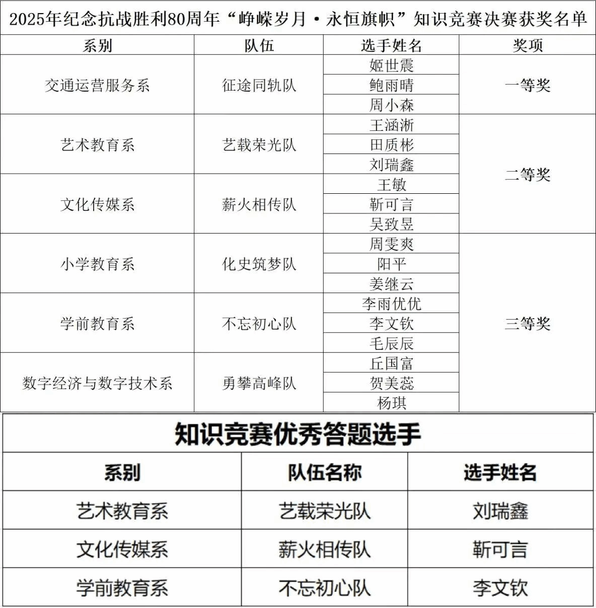 为纪念中国人民抗日战争暨世界反法西斯战争胜利80周年、庆祝新中国成立76周年,进一步学习习近平新时代中国特色社会主义思想,充分发挥思政教育铸魂育人作用,我校举办了“峥嵘岁月•永恒旗帜”知识竞赛。