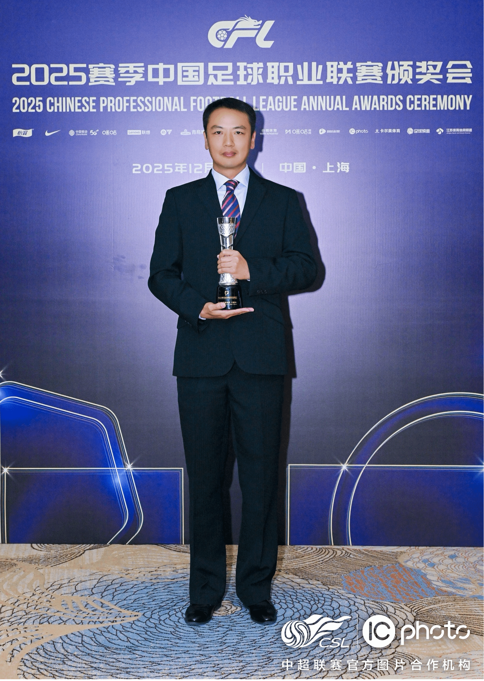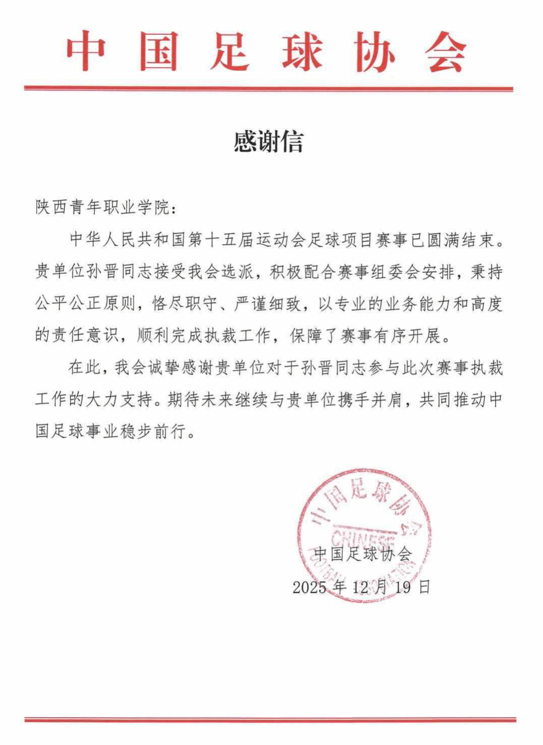 12月12日,2025赛季中国足球职业联赛颁奖典礼在上海举行,我校教师孙晋凭借整个赛季稳定、精准的执裁表现荣获中国足球协会2025赛季最佳助理裁判员(银旗)奖。同时,中国足球协会也向学校发来了感谢信,感谢孙晋老师在中华人民共和国第十五届运动会足球项目赛事值裁的优异表现。