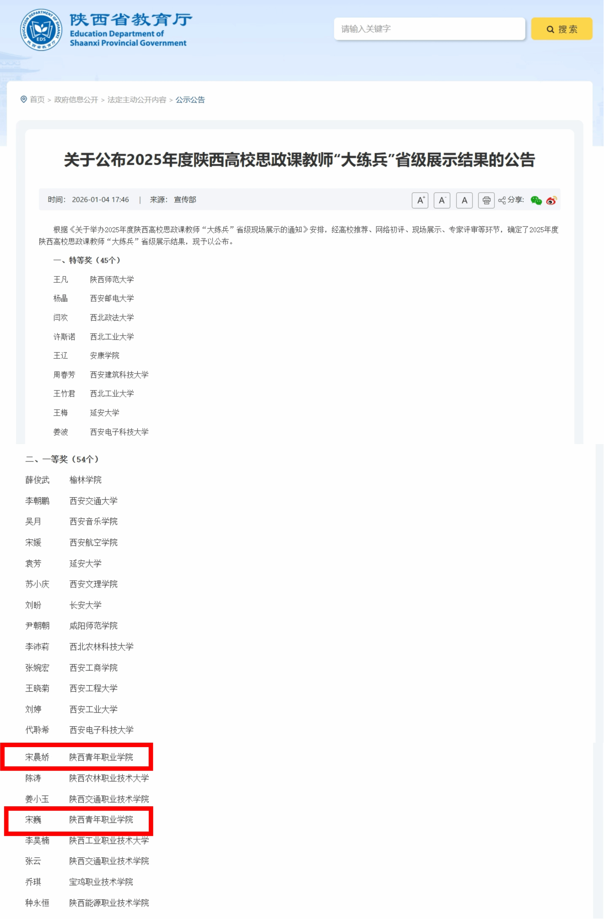 12月24日,由省委教育工委、省教育厅组织的2025年度陕西高校思政课教师“大练兵”省级现场展示在西北大学举行。我校马克思主义学院教师宋晨娇、宋巍同获省级一等奖。
