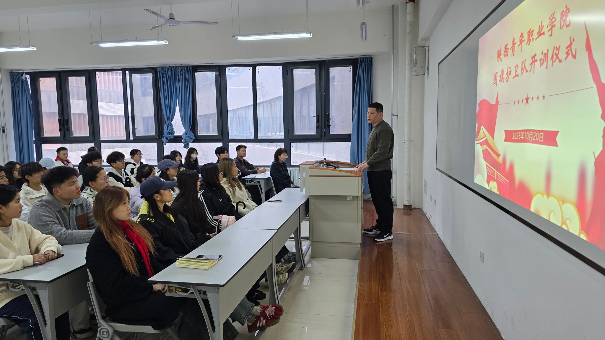 10月20日,我校国旗护卫队2025-2026学年开训仪式在长安校区举行。学生工作部(学生处)副部(副处)长、校征兵工作站站长刘国强,国旗护卫队指导教师以及2025-2026学年国旗护卫队全体队员参加。仪式由国旗护卫队指导教师杨静主持。